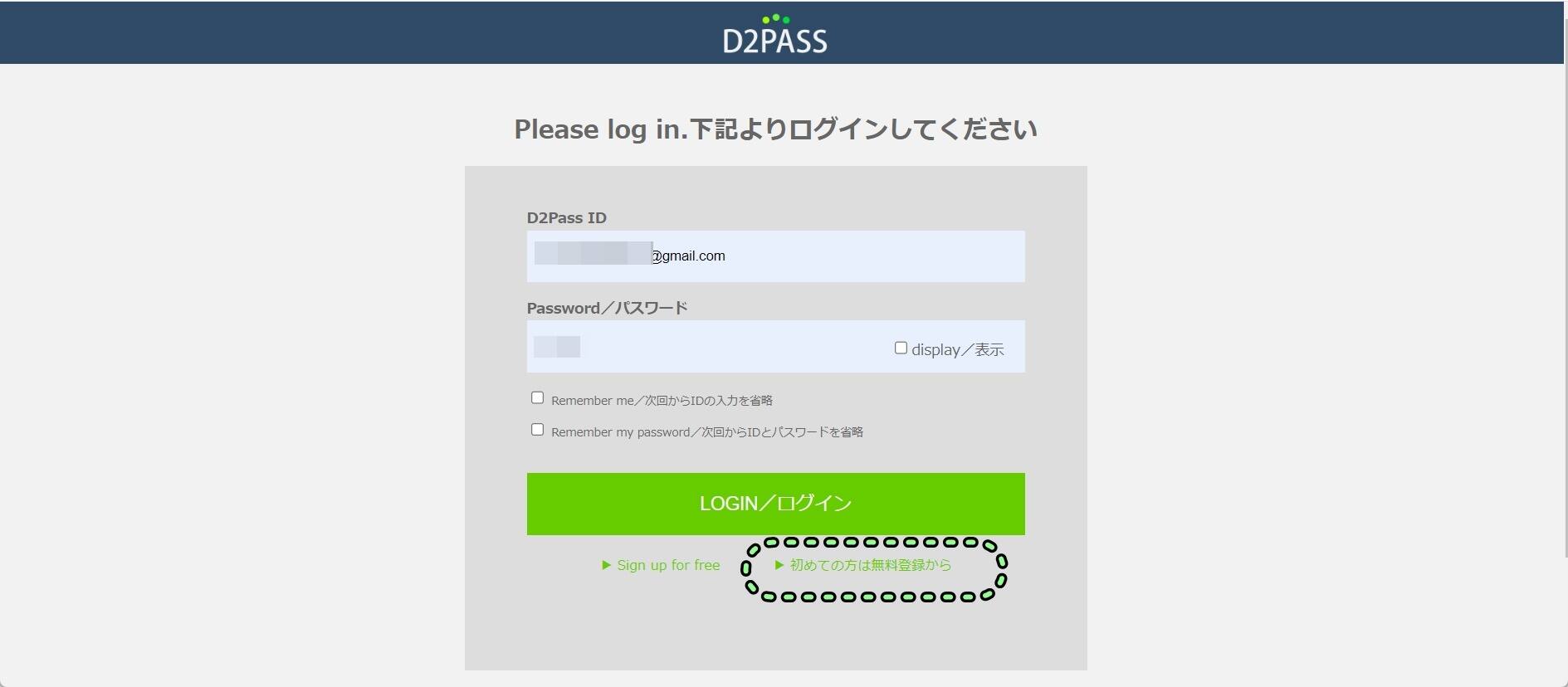 ゴジラは既に「D2 Passアカウント」を持っているのでモザイクをかけていますが、貴殿は『初めての方は無料登録から』作っちゃいましょう。